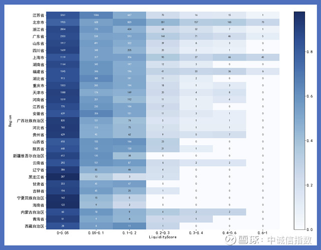 注:横轴为流动性得分,区间为[0,1],纵轴为区域。图中,颜色越深,代表该区域在该流动性得分区间内的债券占比越大,显示数值为该行业在该流动性得分区间内的债券数量