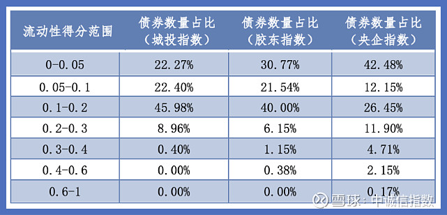 总体看,基于指数成分券权重,央企指数加权流动性得分为0.1623,城投指数加权流动性得分为0.1254,胶东指数加权流动性得分为0.1114,央企指数流动性优于城投及胶东指数,分档来看也同样证明上述结论,具体情况请参见下表: