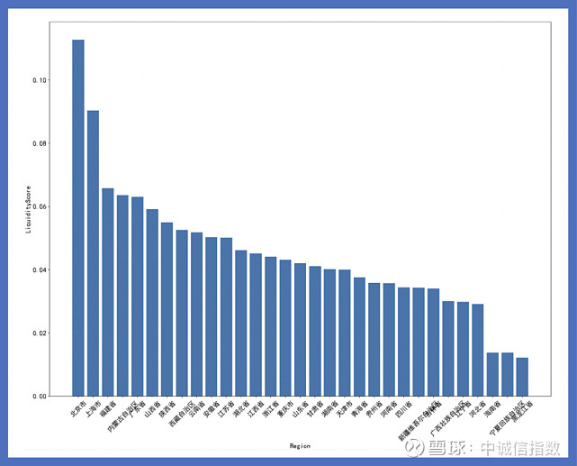 从区域内债券流动性分档看,经济发达省份债券存续数量多,债券平均流动性跨度较大,得分落在高流动性区间债券数量也较多,如北京市、上海市、福建省、广东省等;经济欠发达地区发债量较少,债券平均流动性偏弱,且相对集中于低流动性区间,如海南省、宁夏回族自治区、黑龙江省等,约90%债券流动性落在得分最低区间[0-0.05]。