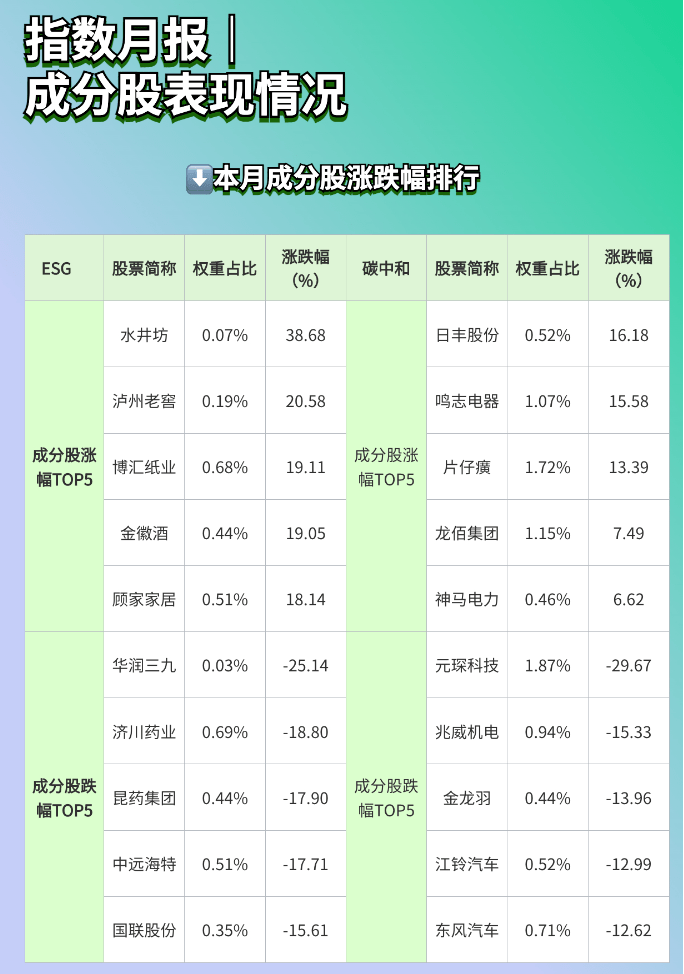 本次月报公布了美丽中国ESG指数和碳中和100指数两大指数的成分股表现情况,其中,水井坊上涨了38.68%,位居美丽中国ESG指数涨幅榜首。泸州老窖、博汇纸业、金徽酒和顾家家居紧随其后,涨幅超过18%,整体相对上月收窄。