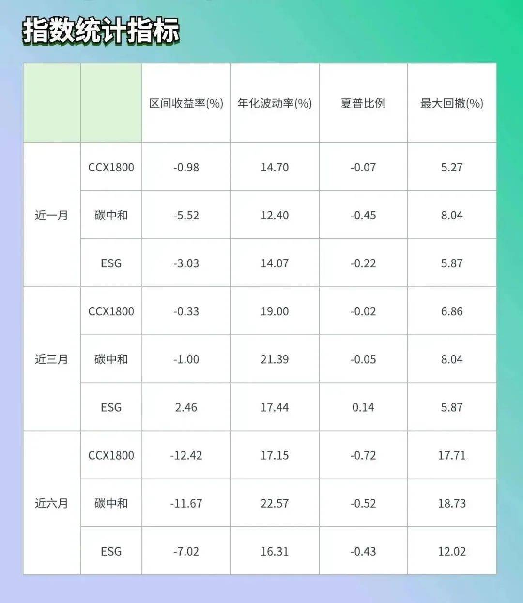 新京报贝壳财经记者注意到,尽管本月两大指数跌幅相对较大,但拉长时间来看,收益率出现分化。从近3个月来看,碳中和100指数和基准指数均出现负收益,而ESG指数却收获2.46%的正增长。
