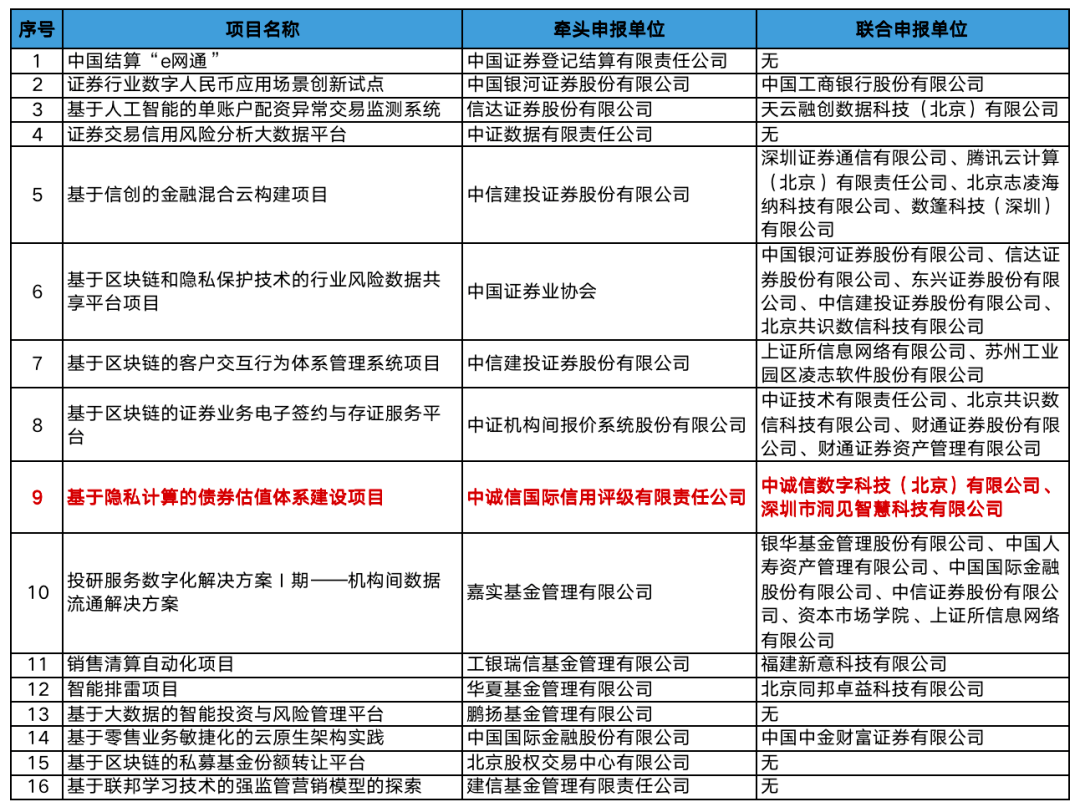 日前,中国证监会正式启动第一批资本市场金融科技创新试点项目,由中诚信国际牵头,洞见科技和中诚信指数联合申报的《基于隐私计算的债券估值体系建设项目》入选首批清单。