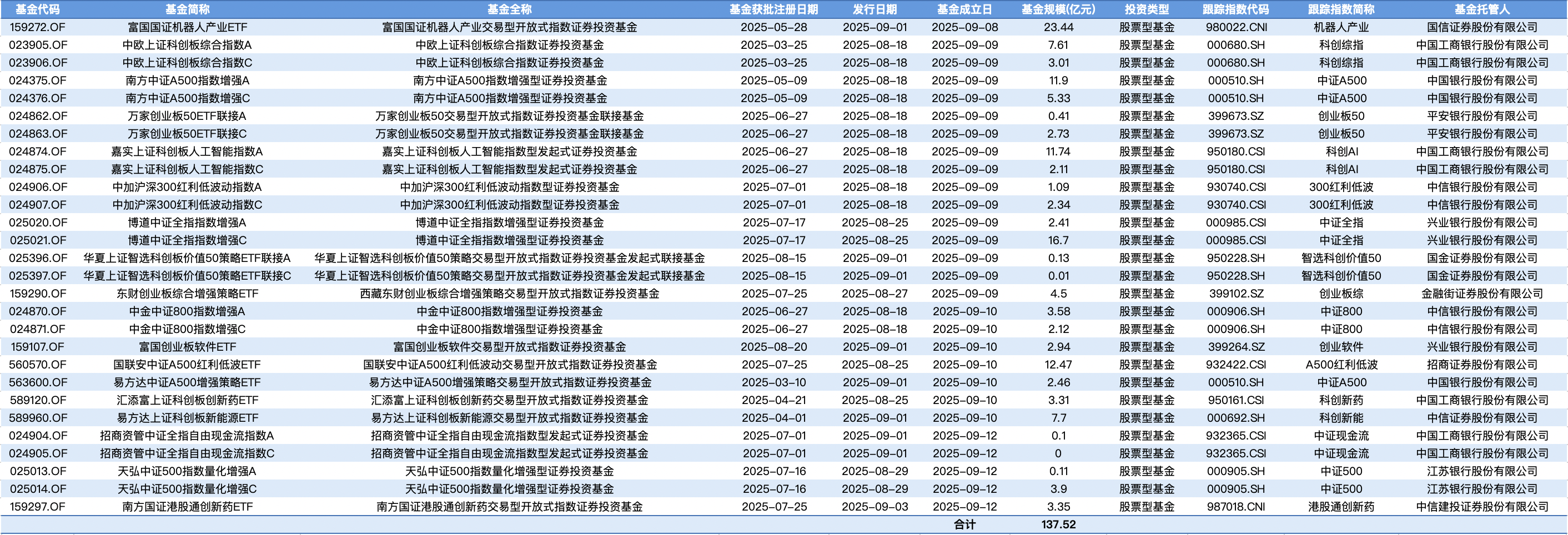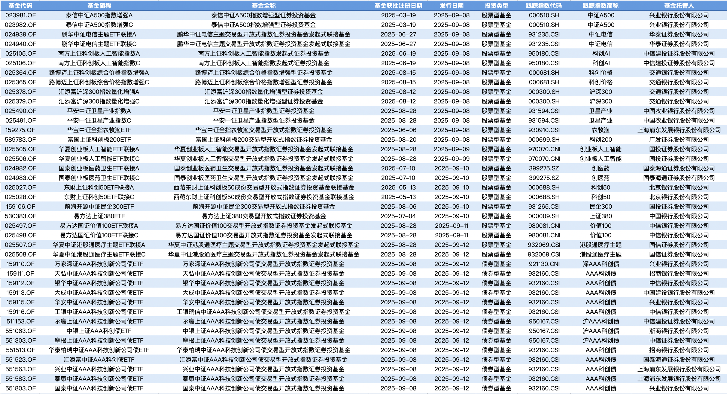 2025年9月8日至2025年9月12日,共有16只基金新申报,25只基金有新进展,第二批科创债ETF集中获批并已开始发行。