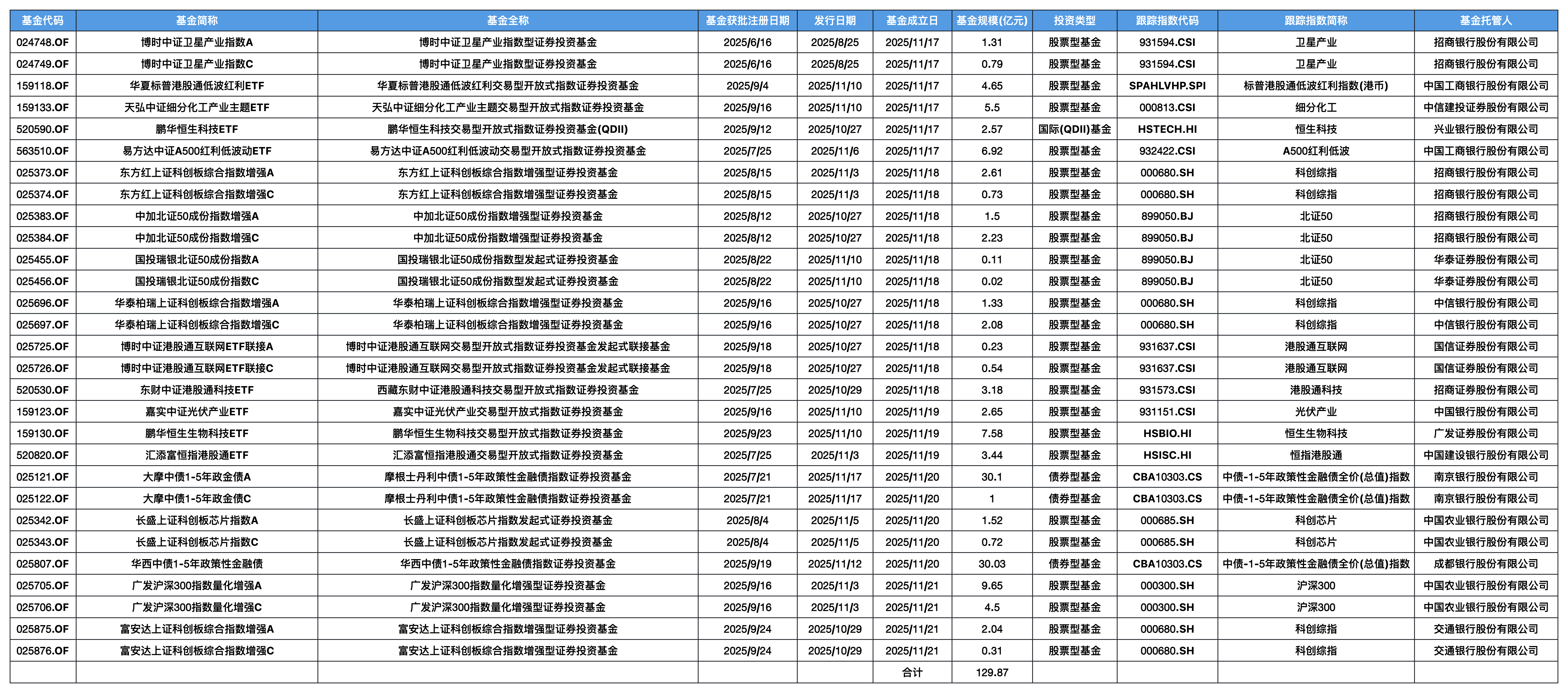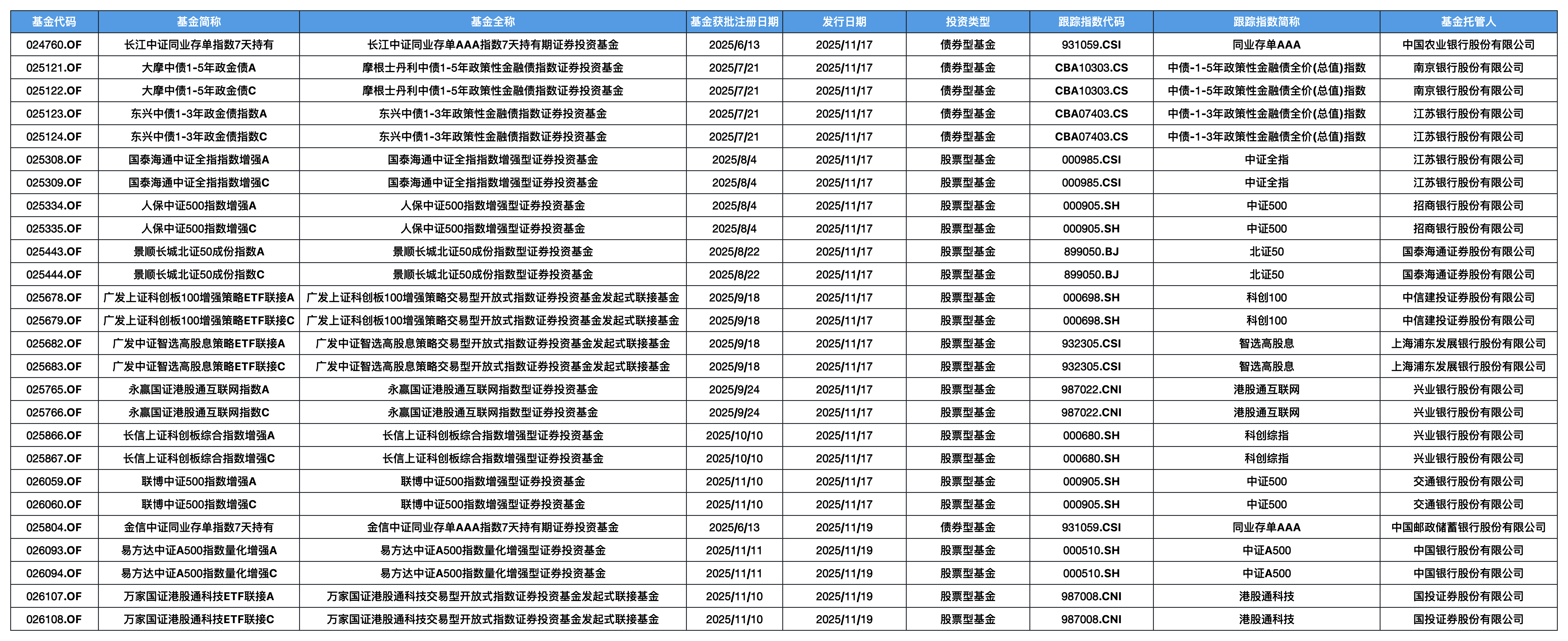 2025年11月14日至2025年11月21日,共有32只基金新申报,15只基金有新进展。