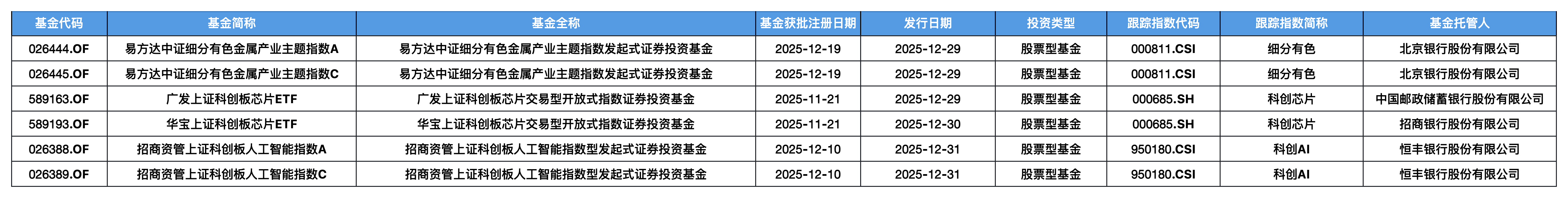 表6 2025年以来成立的指数基金发行规模