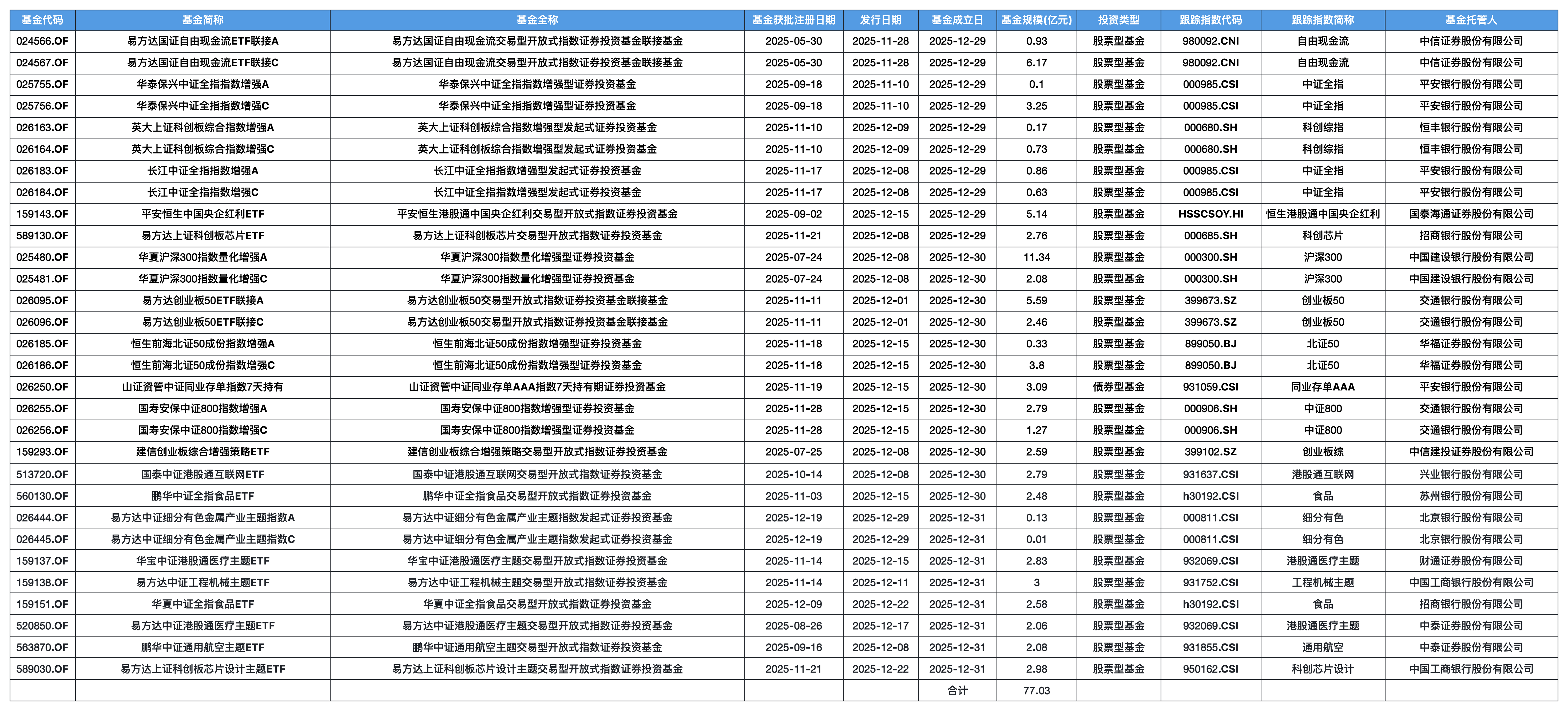 本周成立的指数基金募集规模合计77.03亿元,主要由增强型指数基金和ETF联接基金贡献。
